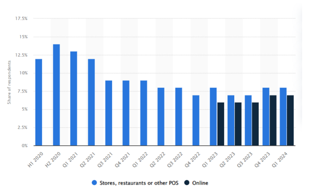 A tad higher during the pandemic, about 8% of users utilised Samsung Pay with their mobile phones to pay for in-stores, restaurants, and other POS in early 2024. Only 7% use a similar payment method when paying online.