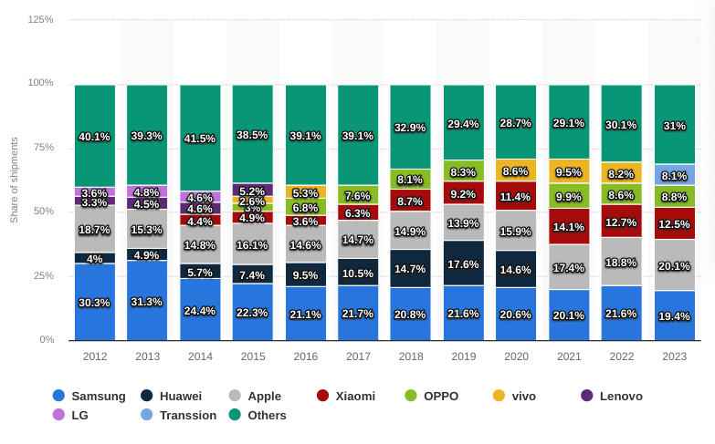 Despite being a consistent front-row competitor in the global smartphone industry, Samsung lagged with only 19.4% market share in 2023, second to Apple’s 20.1% share.