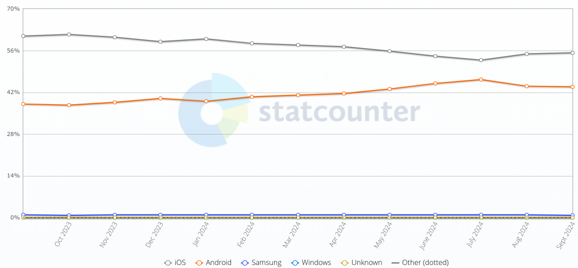 It’s a no-brainer that Apple holds the highest mobile operating system in Australia. As of 2024, Android OS has a 46.21% market share, closing the gap with iOS at 52.77%.
